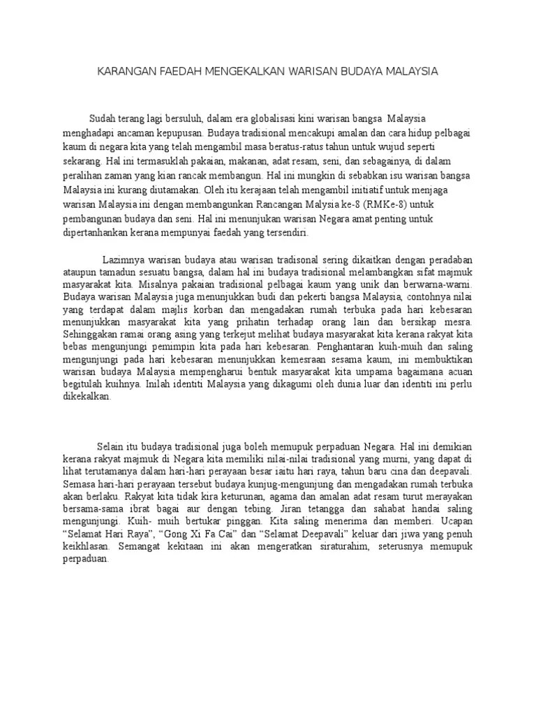 Akibatnya tarian seni budaya tradisional seperti wayang kulit, makyung, ghazal, tarian kipas, . Karangan tentang seni dan budaya. Oleh itu, sebagai persediaan, di bawah dikongsikan contoh karangan usaha melestarikan . Temukan sejumlah artikel penting tentang contoh karangan dengan tema seni budaya berikut ini dan pilih yang terbaik untuk anda. Budaya tradisional mencakupi amalan dan cara hidup pelbagai kaum di negara kita. Hal ini termasuklah pakaian, makanan, adat resam, seni, .